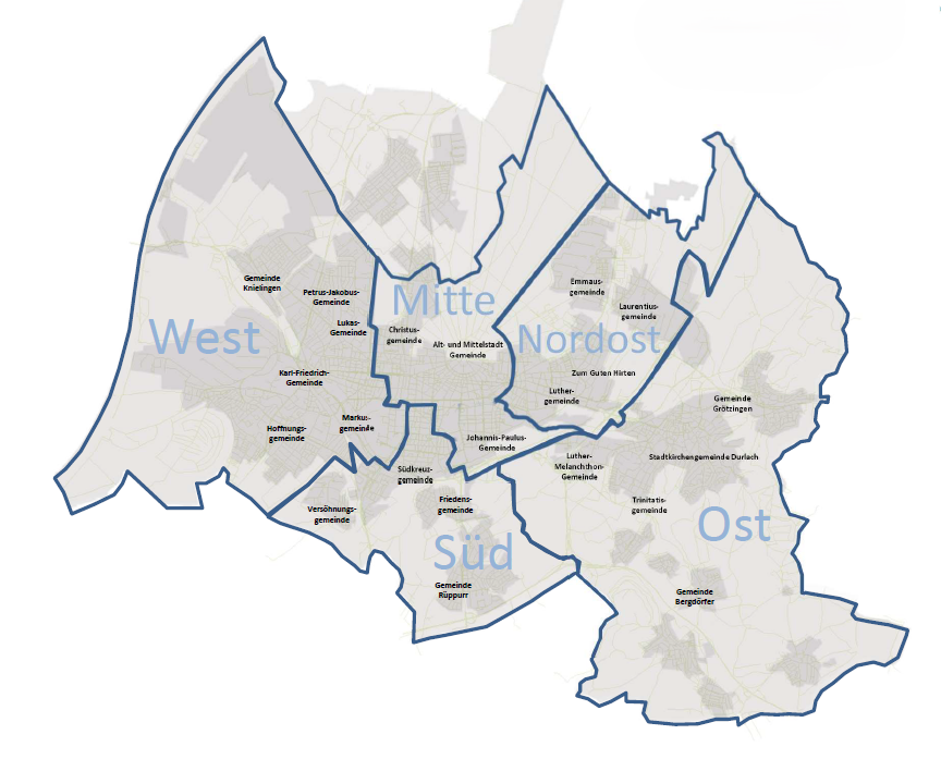 Ost: Stadtkirchengemeinde Durlach, Luther-Melanchthon-Gemeinde, Trinitatisgemeinde Aue, Gemeinde Grötzingen, Gemeinde Bergdörfer