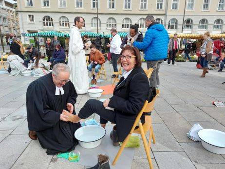 Zwölf Stühle stehen auf dem Karlsruher Marktplatz, darauf nehmen Passanten Platz, die ihre Schuhe und Socken ausziehen, dann wäscht ihnen ein Pfarrer im Talar oder Messgewand die Füße. Diese Szene sorgte am Donnerstagnachmittag (6. April) für Aufmerksamkeit. Denn das, was da geboten wurde, war nicht alltäglich. Aber es passte gut in den Gründonnerstag, an dem die christlichen Kirchen an die Fußwaschung Jesu erinnern.