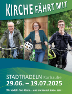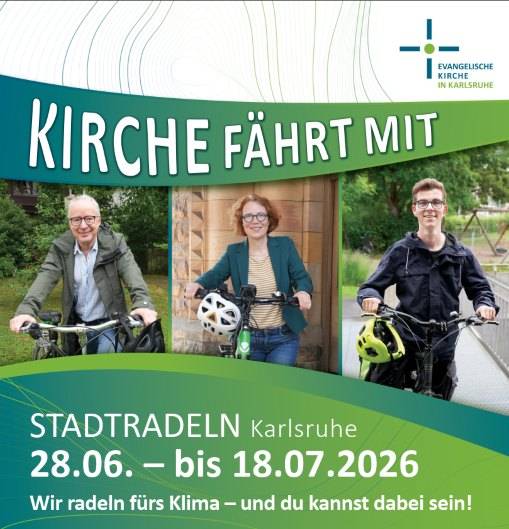 Auch in diesem Jahr beteiligt sich die Evangelische Kirche inKarlsruhe an der Aktion “Stadtradeln”. Vom 28. Juni bis 18. Juli 2026 wird wiederkräftigin die Pedalen getreten - für ein gutes Klimaund eine nachhaltige Radförderung. Die evangelischen Gemeinden,Kindertageseinrichtungen, Kantorate, die Kirchenverwaltung u.v.m. sindeingeladen, teilzunehmen, um gemeinsam ein starkes Zeichen zu setzen: Kirche fährt mit!
