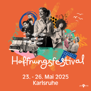 Vom 23. – 26. Mai 2025 veranstalten verschiedene Kirchen und Gemeinden in Karlsruhe ein großes Hoffnungsfestival. Die Gäste erleben auf dem Marktplatz und dem Schloss-Vorplatz ein buntes Event mit Essen & Getränken, Kinderprogramm, Mitmach-Aktionen und Interviews. In kreativen Sessions mit bewegenden Lebensgeschichten, Musik und inspirierenden Talks zu alltagsrelevanten Themen, Spiritualität und christlichem Glauben können die Besucherinnen und Besucher neue Perspektiven gewinnen.