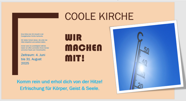Neun evangelische Kirchen in Karlsruhe öffnen ab dem 4. Juni bis 31. August ihre Türen, um an besonders heißen Tagen Kühle zu spenden. Es gibt Trinkwasser und die Möglichkeit, zur Ruhe zu kommen.