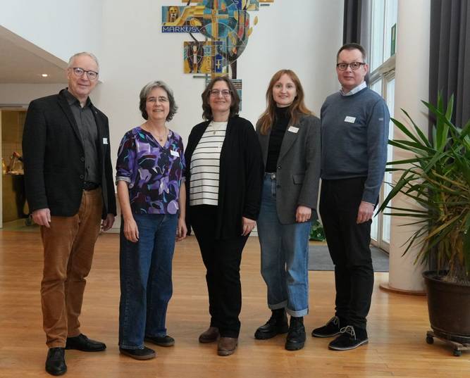 Gruppenfoto: v.l. Dr. Thomas Schalla, Dekan (evang.), Monika Roth, Diakonin (evang.), Elke Litterst, Pastoralreferentin (kathol.), Clarissa Wolk, Referentin für AltenHeimSeelsorge in der Erzdiözese Freiburg, Markus Miles, Dekan (kath.)