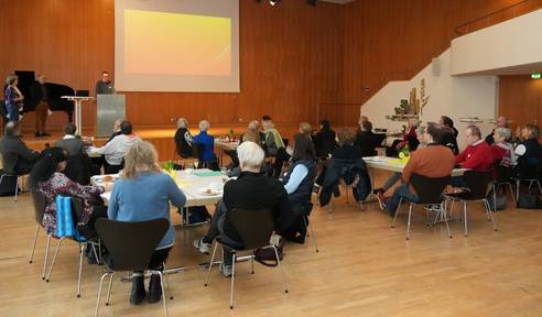 35 Personen, darunter auch Einrichtungsleitungen, sind der Einladung in den Albert-Schweitzer-Saal an diesem Jahresauftakt gefolgt. Und wie es sich für einen Neujahresempfang gebührt, wurde bei dieser Gelegenheit auch mit einem (alkoholfreien) Glas Sekt auf das neue Jahr angestoßen. Eingeladen hatten die Fachstelle Leben im Alter der Evangelischen Kirche in Karlsruhe mit Diakonin Monika Roth und Pastoralreferentin Elke Litterst von der Pfarrei St. Stephan.